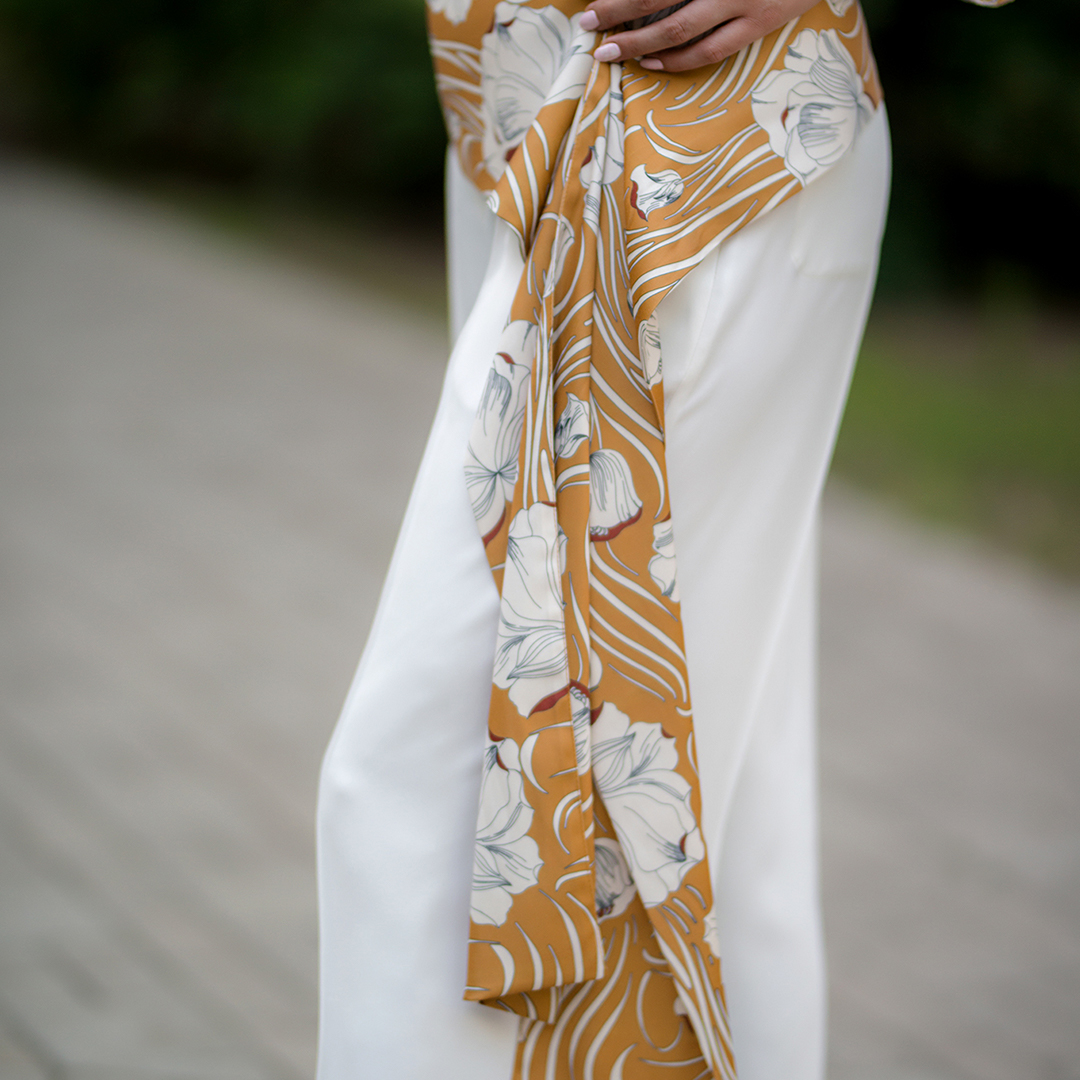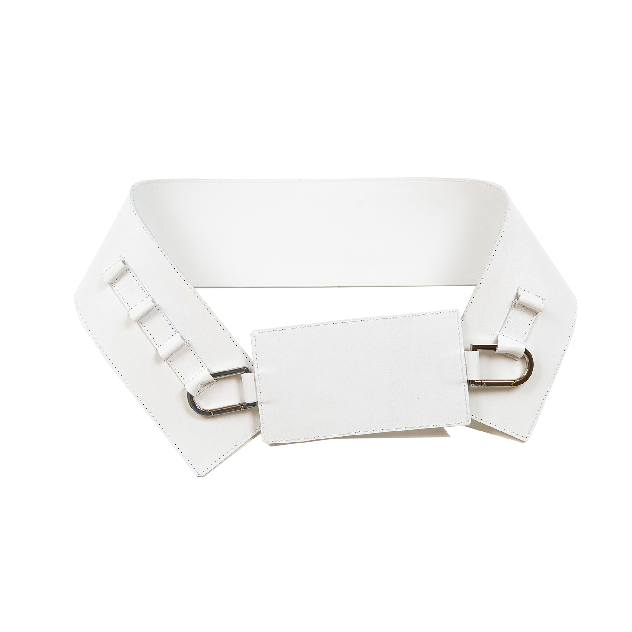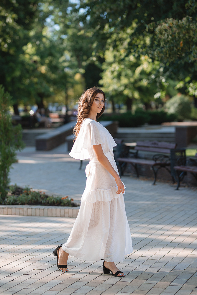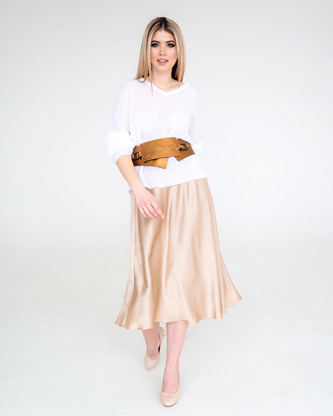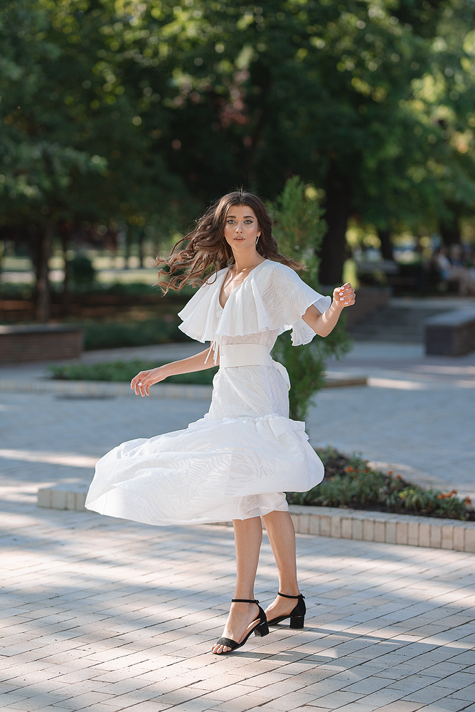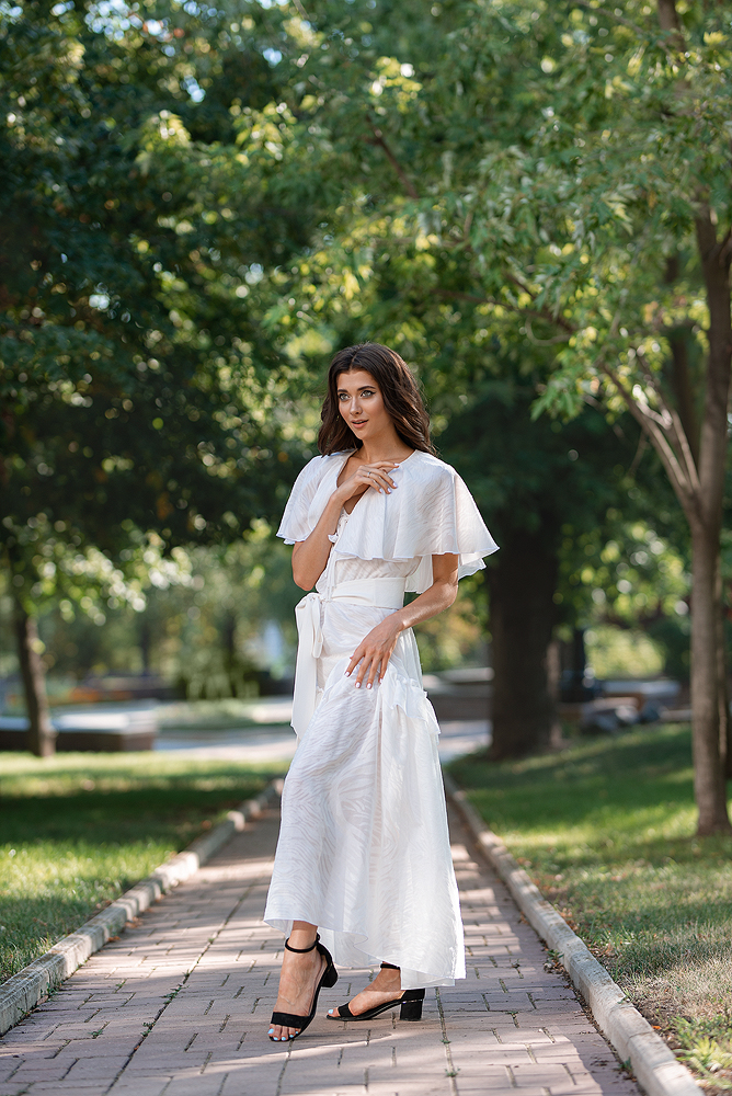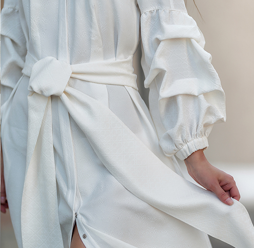 ✔ Широкий и длинный белый пояс эффектно подчеркивает талию.