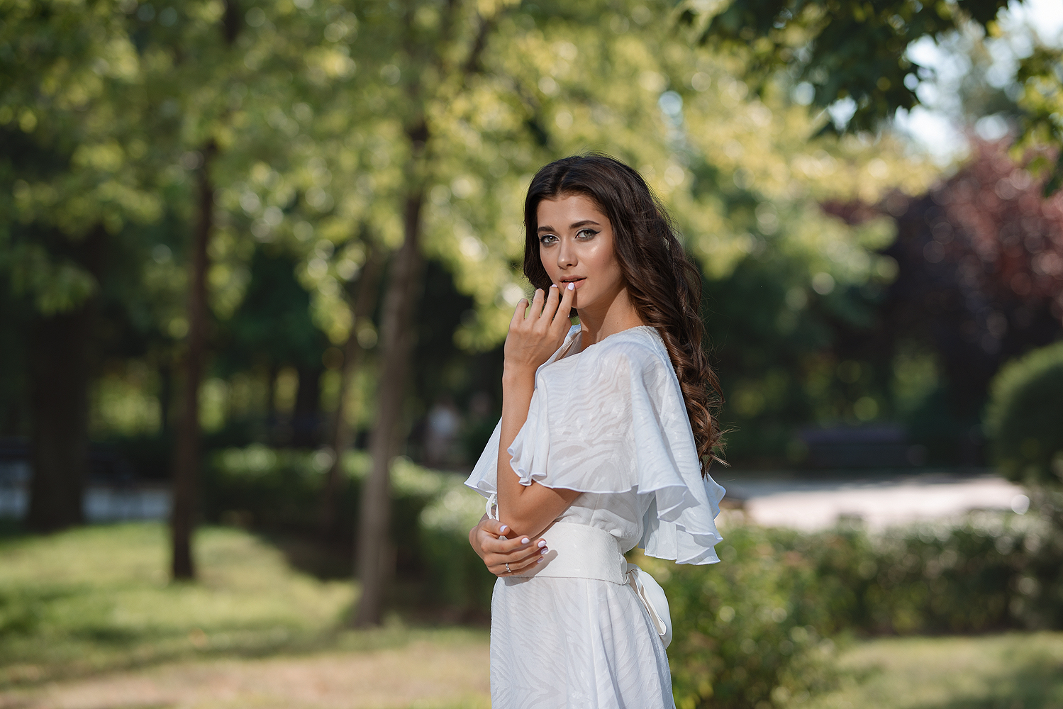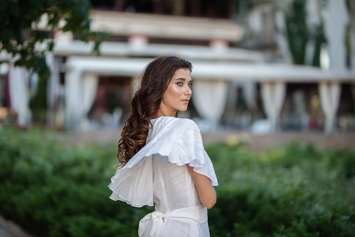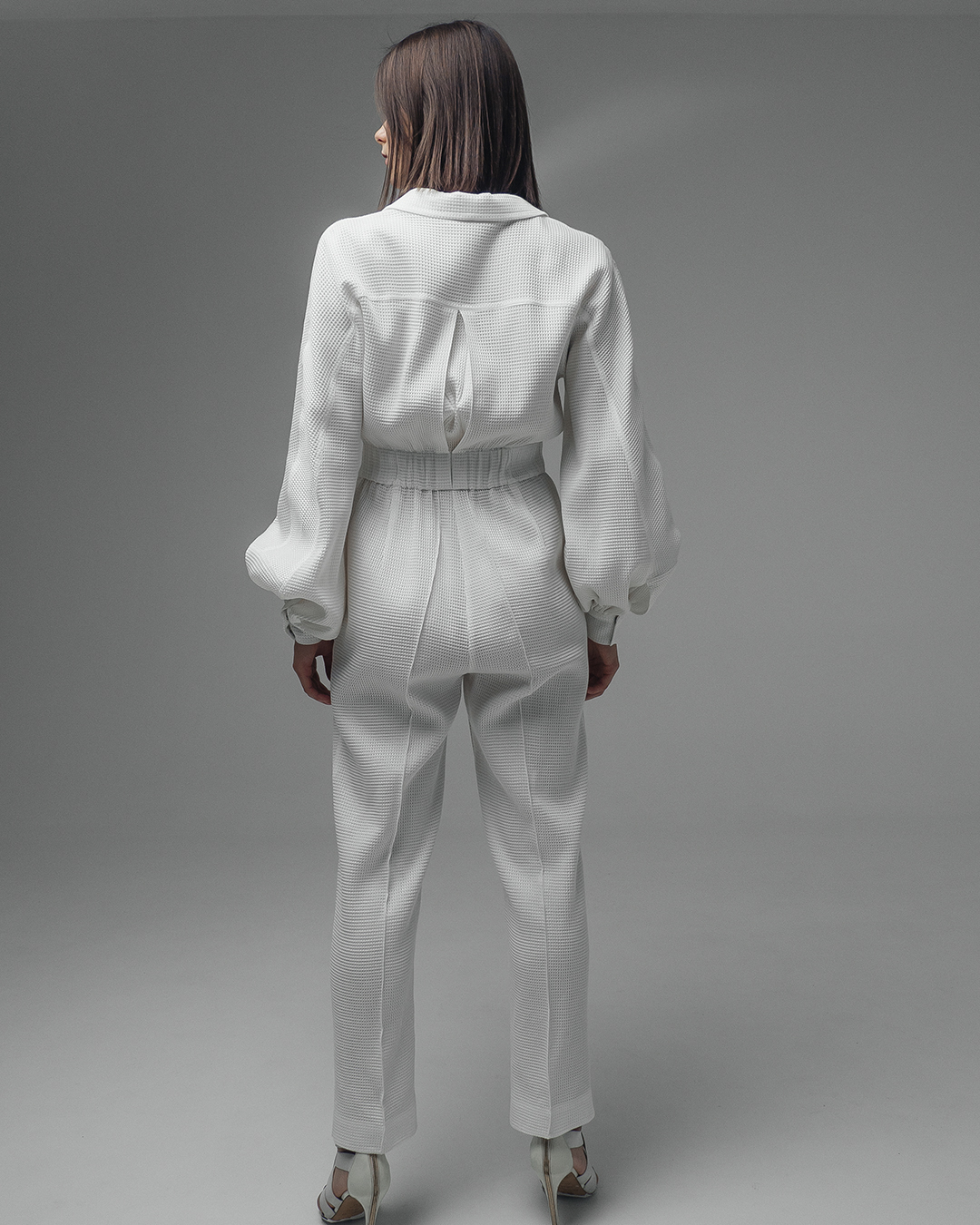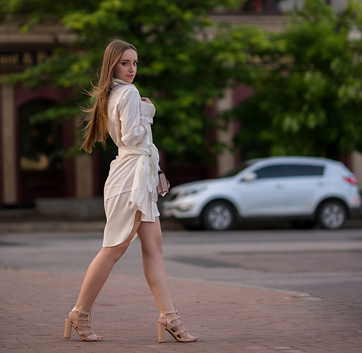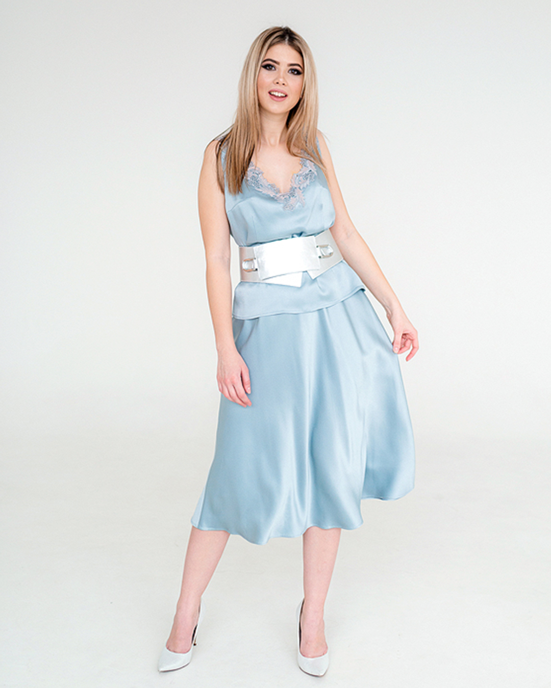 ✔ Широкий и длинный белый пояс эффектно подчеркивает талию.