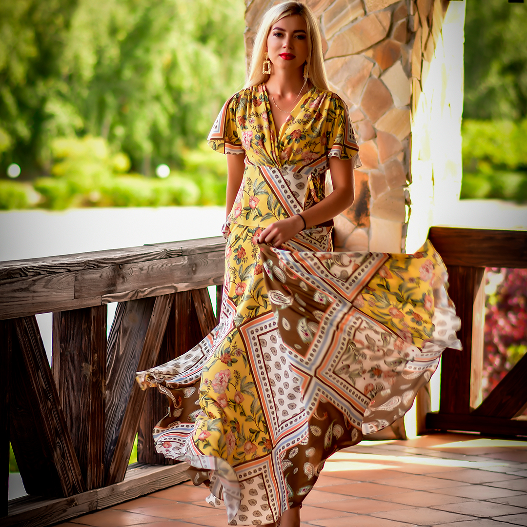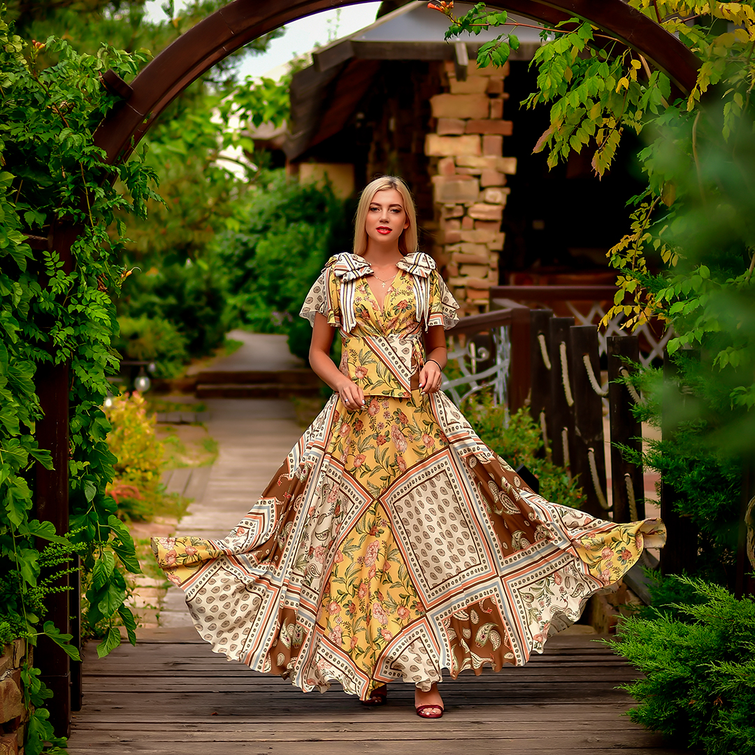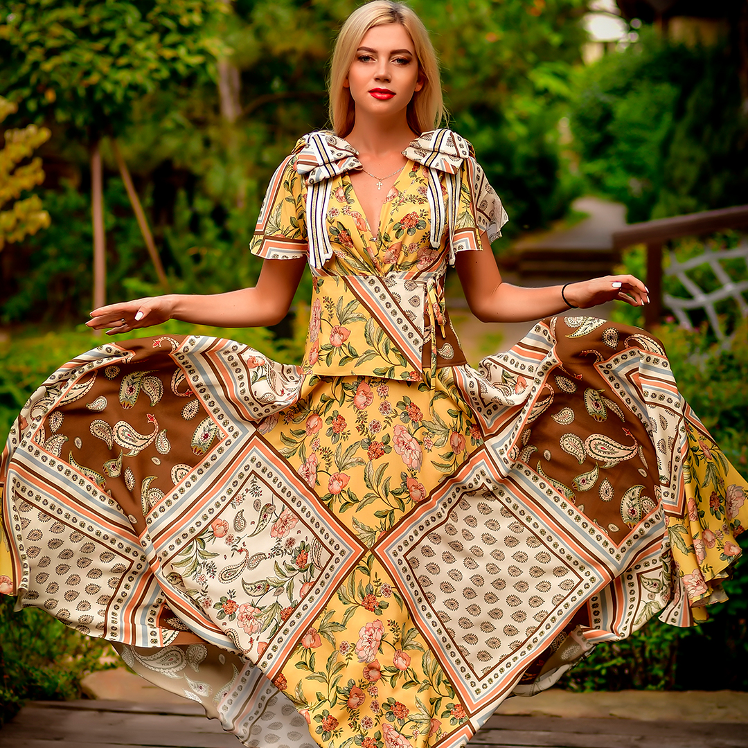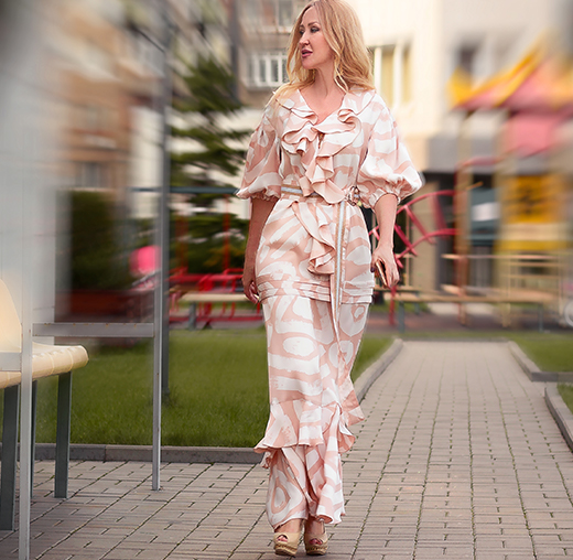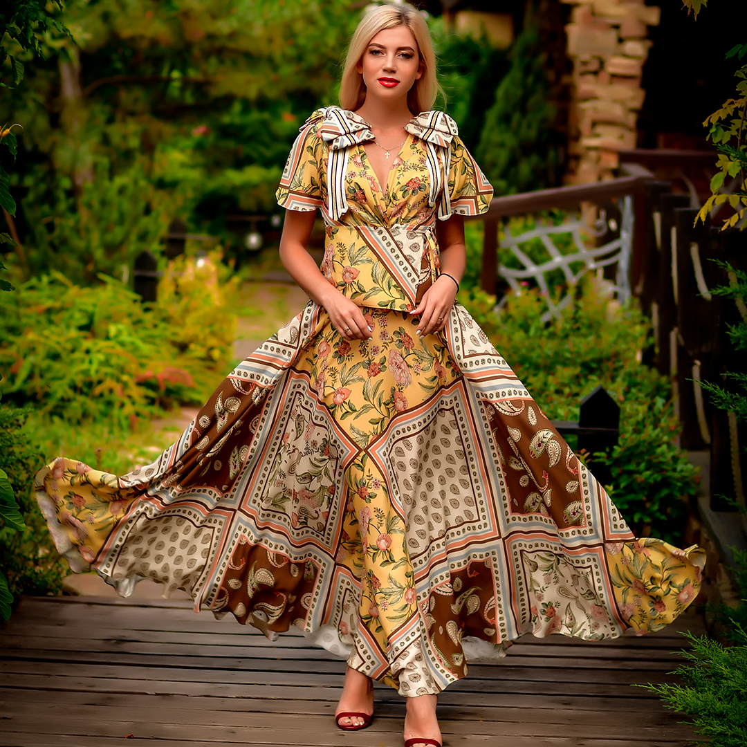 ✔ Широкий пояс подчеркивающий талию, юбка в пол, дополненная воланами по краю и супер актуальные объемные рукава делают это платье фаворитом сезона.