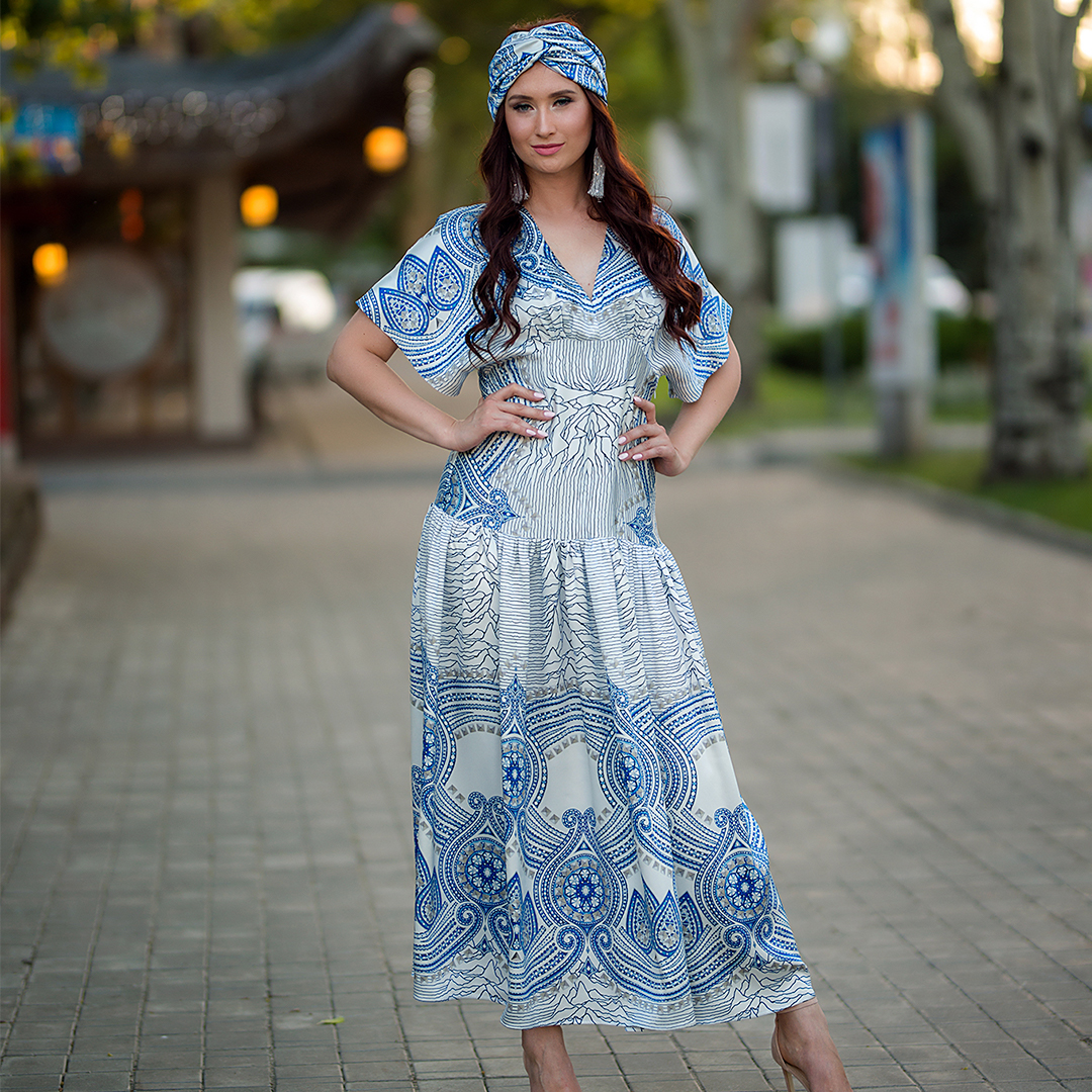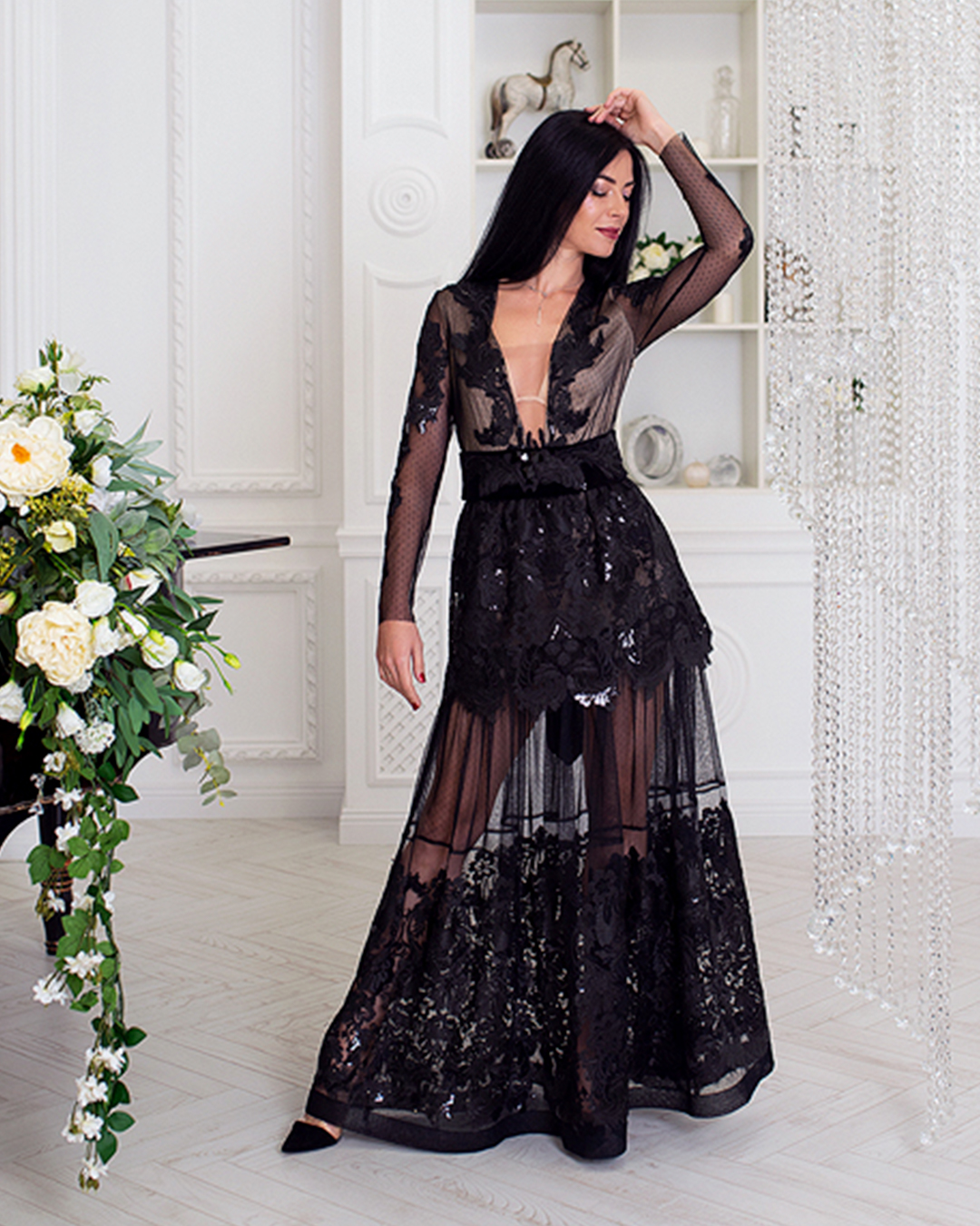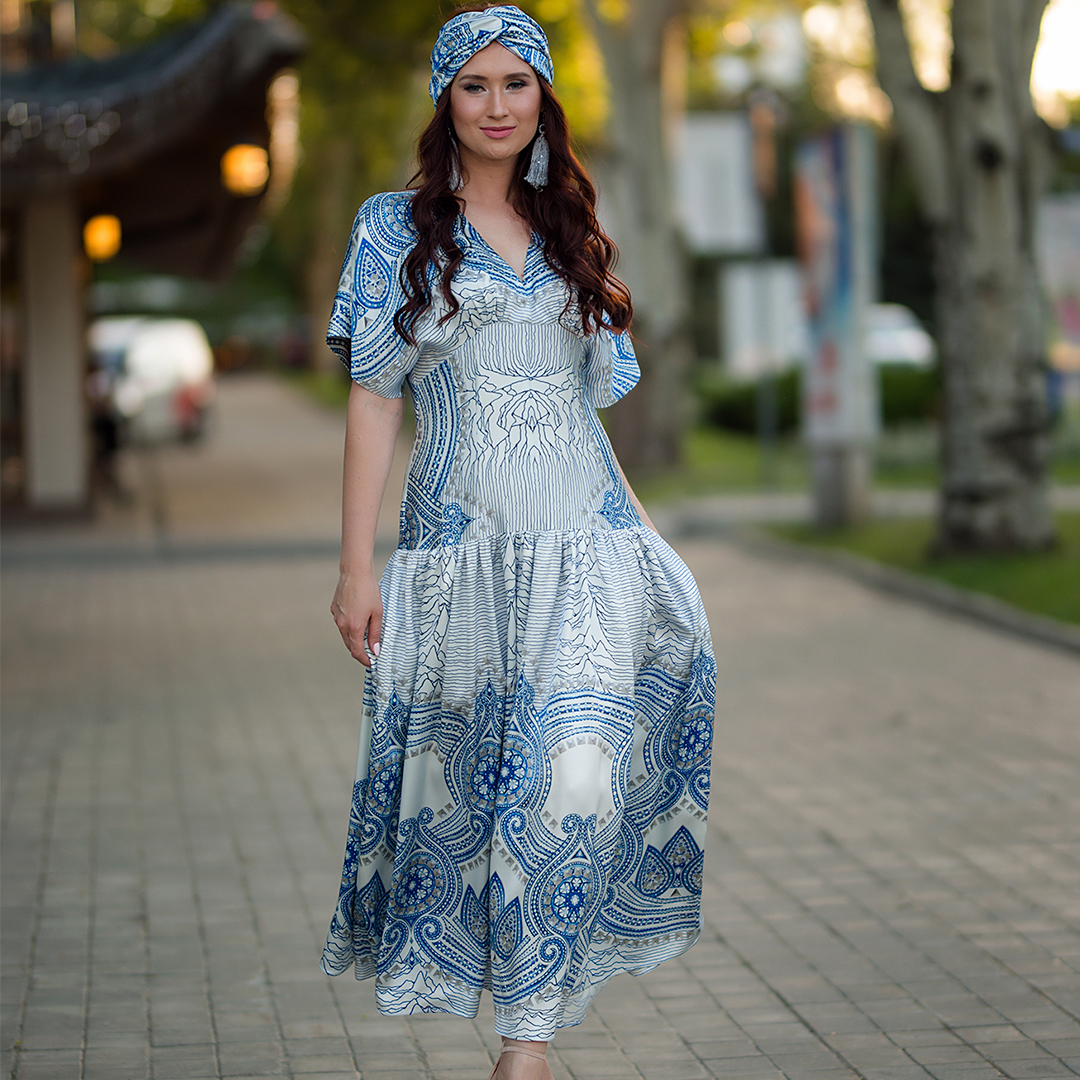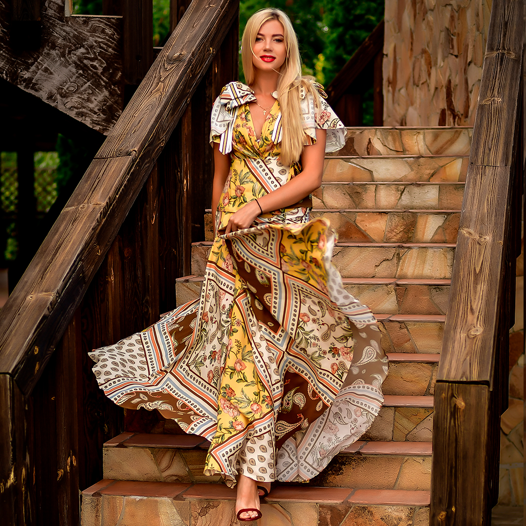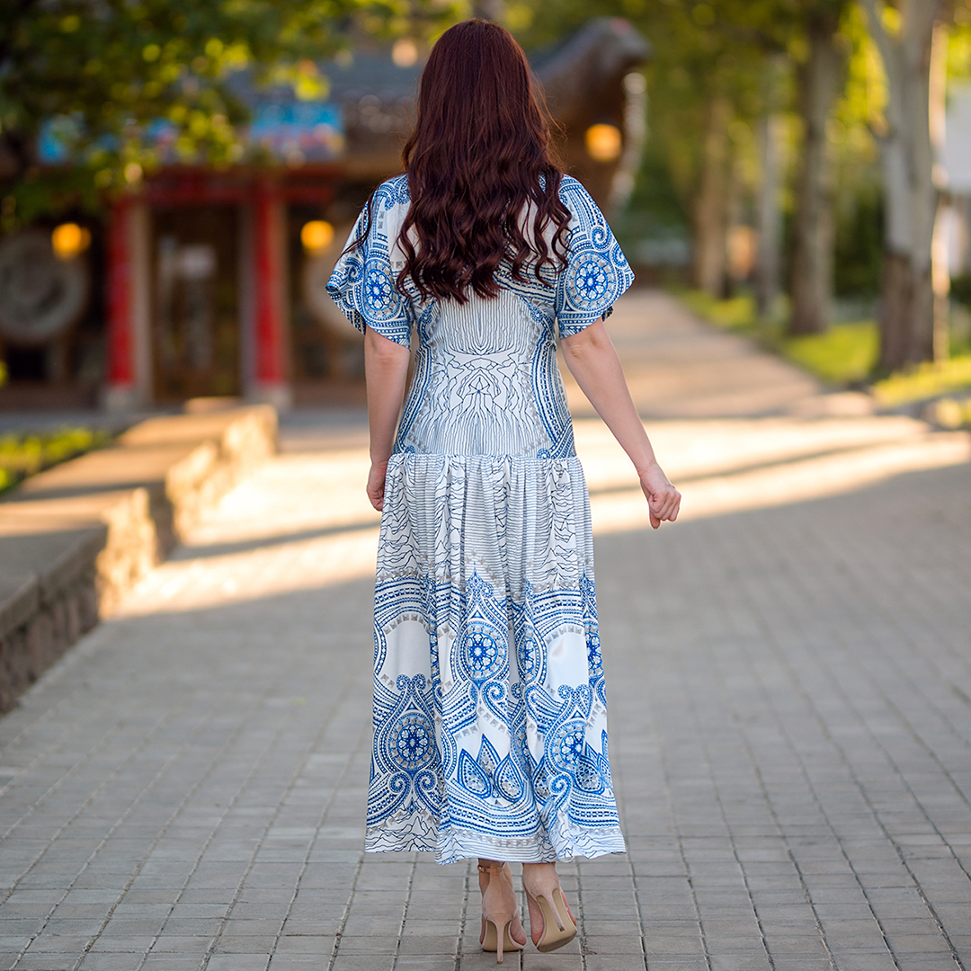 ✔ Широкий пояс подчеркивающий талию, юбка в пол, дополненная воланами по краю и супер актуальные объемные рукава делают это платье фаворитом сезона.