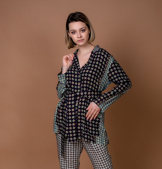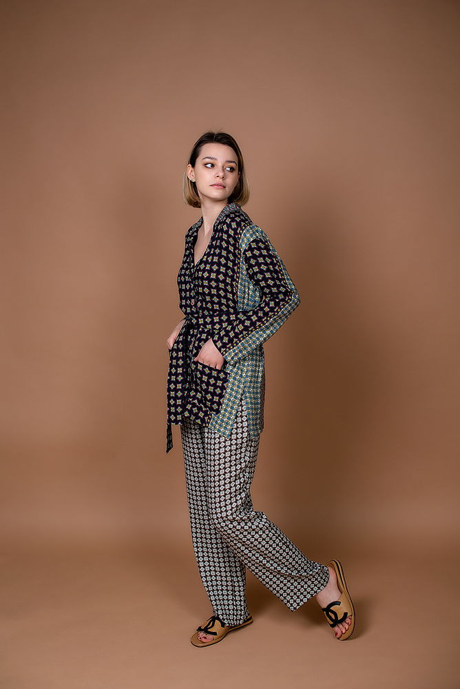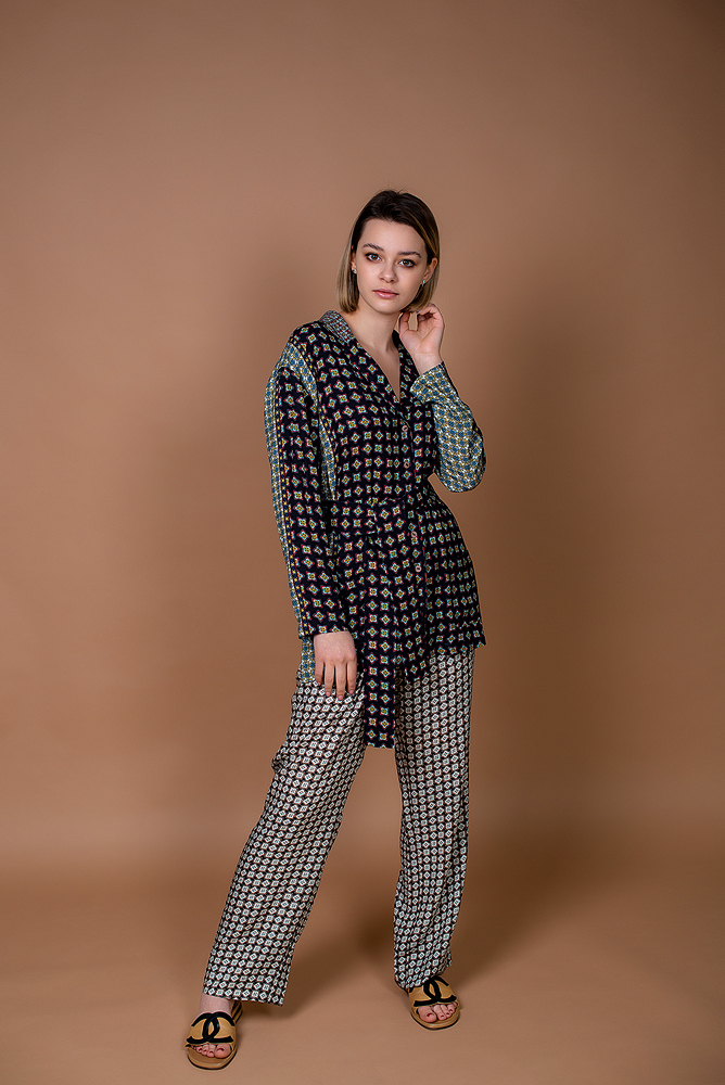 ✔ Прямого сидуэта. Отложной воротник. Застежка на пуговицы в потайной планке. Двойные рукава с манжетами на пуговицах. Два накладных кармана на груди.